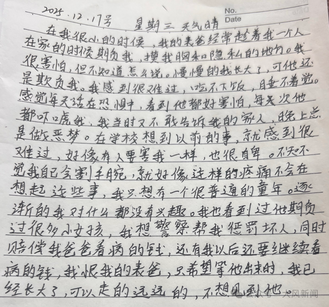 她写谈:在我很小的时候,我的表爸频频趁着我一个东谈主在家的时候羞耻我。我很发怵……嗅觉每天活在忌惮中,看到他齐好发怵,每次他齐吓唬我,我那时又不敢告诉家东谈主,晚上老是作念噩梦……悄然无声我我方会割手腕,就大致这么的凄凉不会在(再)想起这些事,我只想有一个很往常的童年……我也看到过他羞耻过许多小女孩,我想窥察帮我处罚坏东谈主,我恨我的表爸。