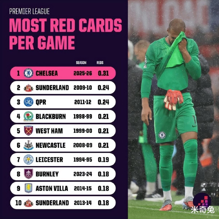 在赢来世俱杯冠军之后,切尔西的新赛季被许多东谈主请托厚望,没念念到他们却跌入了“红牌罗网”。他们爱英超前13轮拿到了4张红牌(场均0.31张),这个后果要是保持下去,以至不错创造英超新记录。