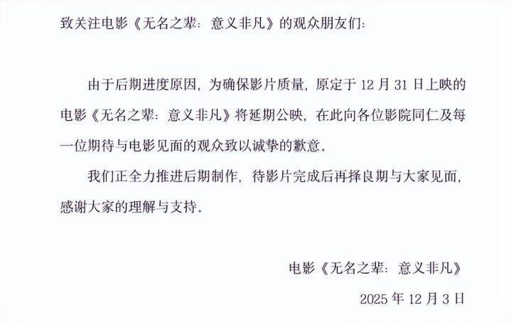 比如刘德华主演的《无名之辈3》,影片原定12月31日寰球公映,磋议词月初却忽然发布声明,暗意因为“后期制作”的原因延伸上映。具体上映时刻未知。