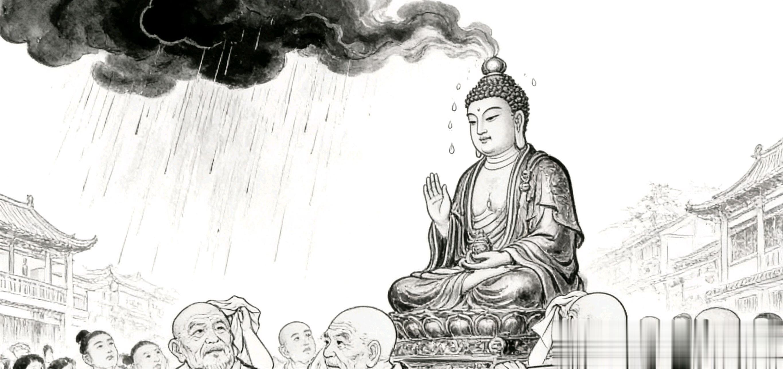 匹夫们惊呼连连,纷繁取来布巾,争着去拭佛汗。说来更奇,那布巾一触到佛汗,便变得湿淋淋的,而铜佛的汗珠,竟越拭越多,仿佛用之握住。未时刚到,忽然一阵暴风刮过,铜佛顶上竟升空一团黑云,黑云越扩越大,很快便漫山遍野。紧接着,雷声滚滚,甘雨澎湃而下,匹夫们忻悦若狂,跪在雨中,对着铜佛叩首不啻。